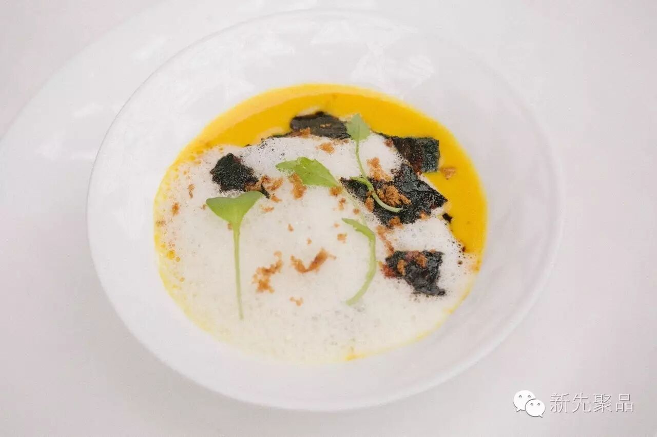 第一道南瓜浓汤,顺滑浓郁的南瓜浓汤和烤炙的伊比利亚切片火腿碰撞。现磨制的南瓜汤味感柔和,伊比利亚火腿味道浓郁。伊比利亚火腿切片烤炙后油脂不仅会降低,口感也会更丰富。加入飘在上层的泡沫,再次把两种原材味道的碰撞感提升。