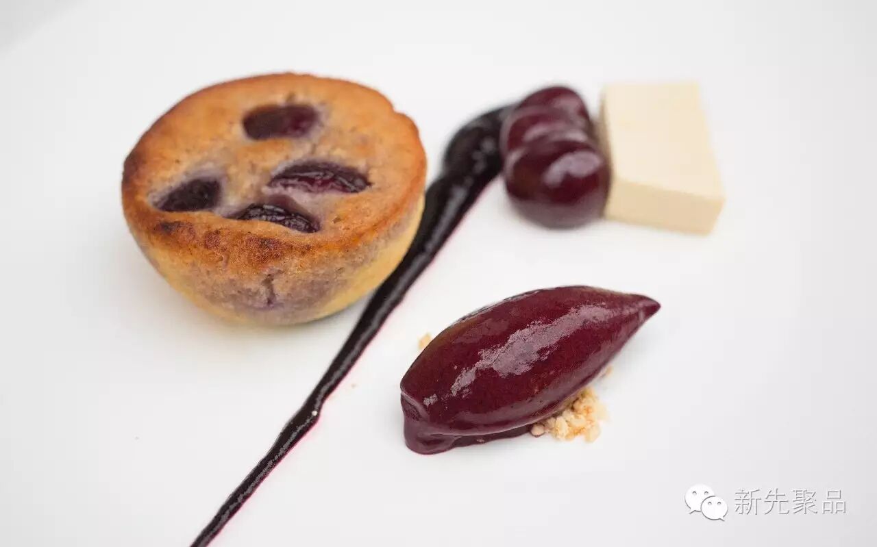 第五道甜点黑樱桃和榛子费南雪,费南雪现烤后第一时间上桌。法国黑樱桃,新鲜树莓打制成冰激凌状,底部垫入榛子碎,冷热的碰撞。樱桃甜冻糕、新鲜樱桃以及樱桃果酱多重口感。趁热趁凉一同进食,配甜酒或者咖啡,经典法式甜点的风格。