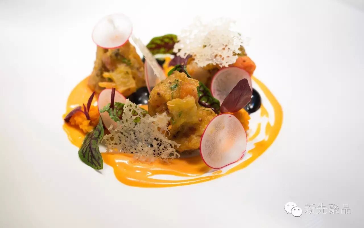 第二道香脆玛沙拉牡蛎和软壳蟹煎饼。用平锅煎烤的芝士珊瑚碎饼,结合薄如蝉翼的水萝卜片做味道上的点缀。酱汁用黑蒜泥加入蛋黄酱,并入日本海胆汁,外加日本柚子的清甘之味。主体选用法国牡蛎和日本软壳蟹来做玛莎拉。最终塑造出多层次口感的对比,玛莎拉的脆,海胆汁的顺滑浓郁,柚子和水萝卜的小小清爽,让你的味觉触电。