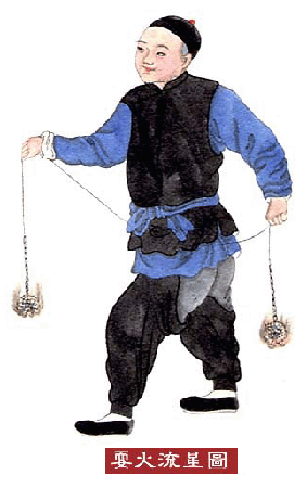 耍者以绳子一根,两头拴铁丝笼,内盛炭火,名曰“火流星”。耍时,两手弄绳、飞旋,铁丝笼内炭火,上下飞舞,火花飞溅,形似流星。耍火流星或双手飞舞,或倒地翻滚,或凌空盘旋,有“二龙戏珠”、“飘洋过海”、“背流星”等名称。