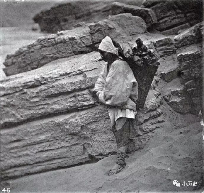 从宜昌到巫峡的长江沿岸,一个背负木材的妇女。为了适应艰苦的环境,她没有裹小脚。
