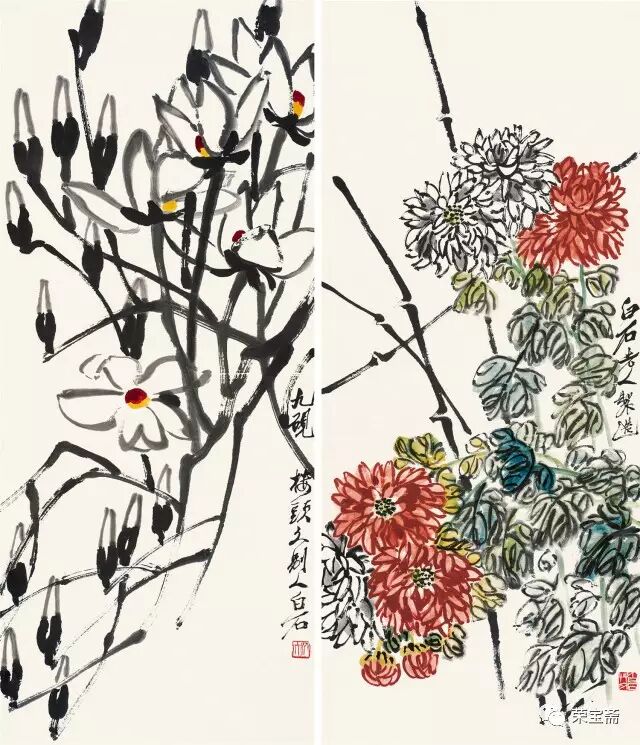 LOT.93 齐白石 玉兰、秋菊对屏 约3.6平尺/幅