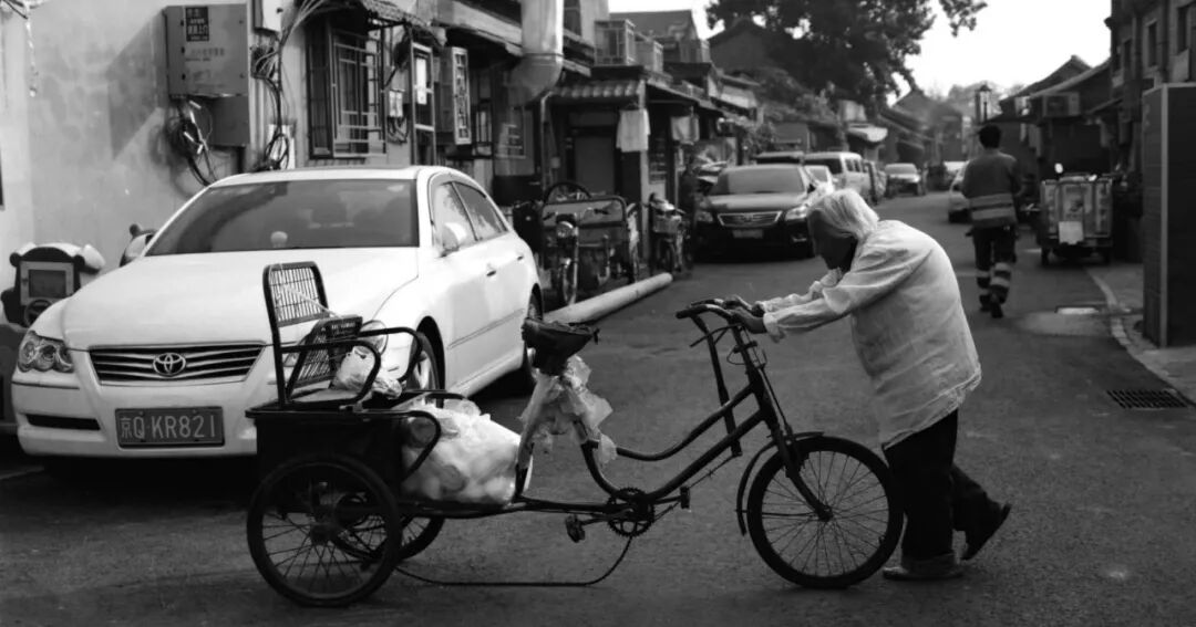 贾勇:几个月前在胡同里走,看见一个老太太,驼着背,推着一个破三轮车,链子掉了,后面一排胡同里停的特别棒的汽车,我给抓下来了。汽车和掉链子的三轮车,老态龙钟的老太太倒着推三轮车,语言都在里头了。