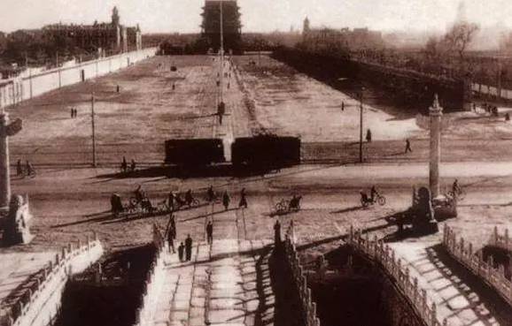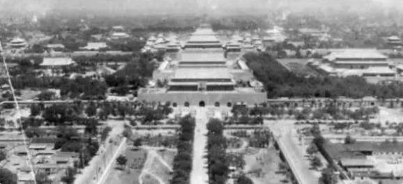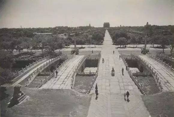 一条笔直的甬道,从金水桥直通向正阳门;甬道的两旁是郁郁葱葱的小树林,树林里还有建筑。