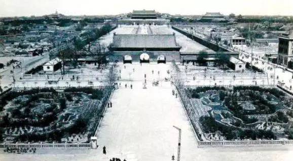 1932年2月时的天安门。今日天安门广场的位置当时是街心花园。那时前门两侧的城墙还完好无损。