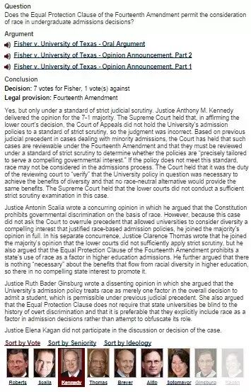 但是最奇怪的事情发生了:费舍尔诉得克萨斯大学的判决书简单地出奇,以肯尼迪大法官主笔的判决书只是把案子发回下级法院,他得到了其他六位法官的支持,只有金斯伯格异议(卡根可能因为担任奥巴马政府首席律师的时候参与帮助得克萨斯大学的工作,在此案回避了)。
