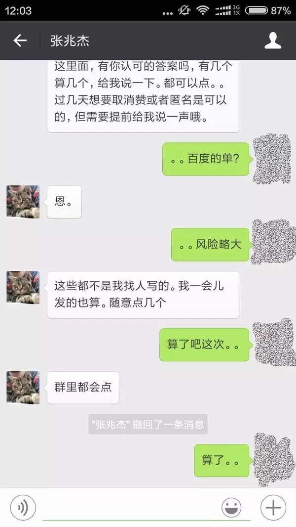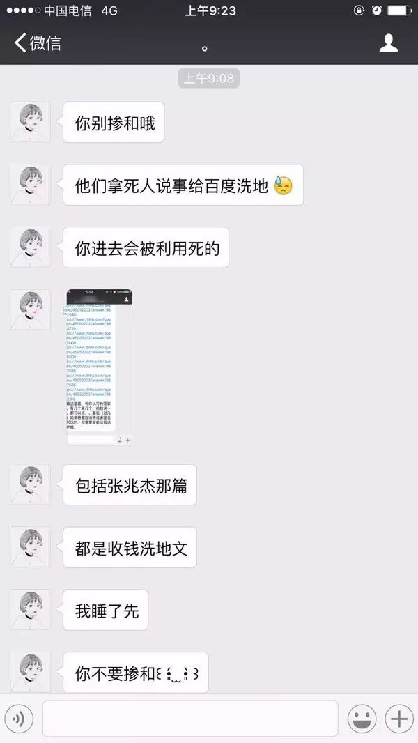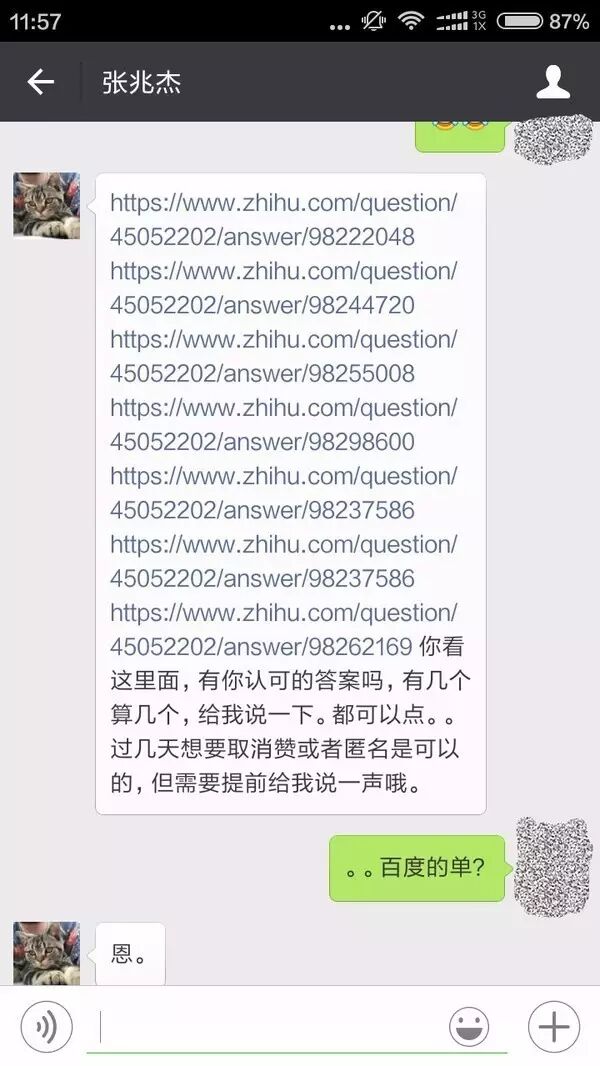 @vvvincent在回答中直接贴出了声称@张兆杰 百度公关事件当天的对话截图