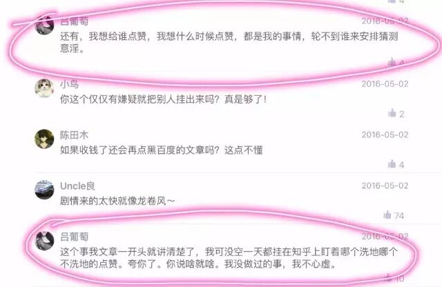 “5月1日21:00左右 吕葡萄才开始装模作样为黑百度的回答点赞”
