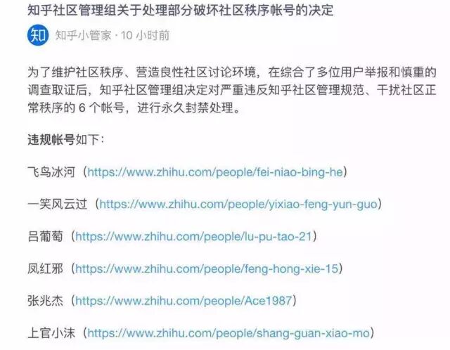 昨天下午知乎官方终于发表声明,对六个账号进行了永久封禁处理