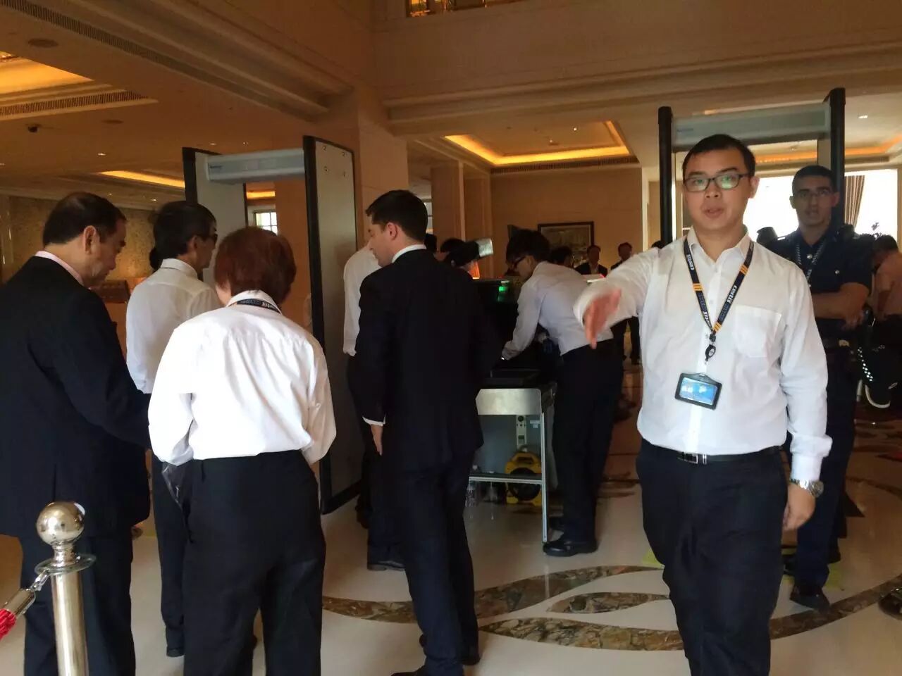 瑞吉酒店内已架起安检设备,安保全面升级。工作人员表示,今天瑞吉已被中方全部包下,记者不能进入酒店。这名工作人员还拒绝透露晚宴是否在酒店举行。