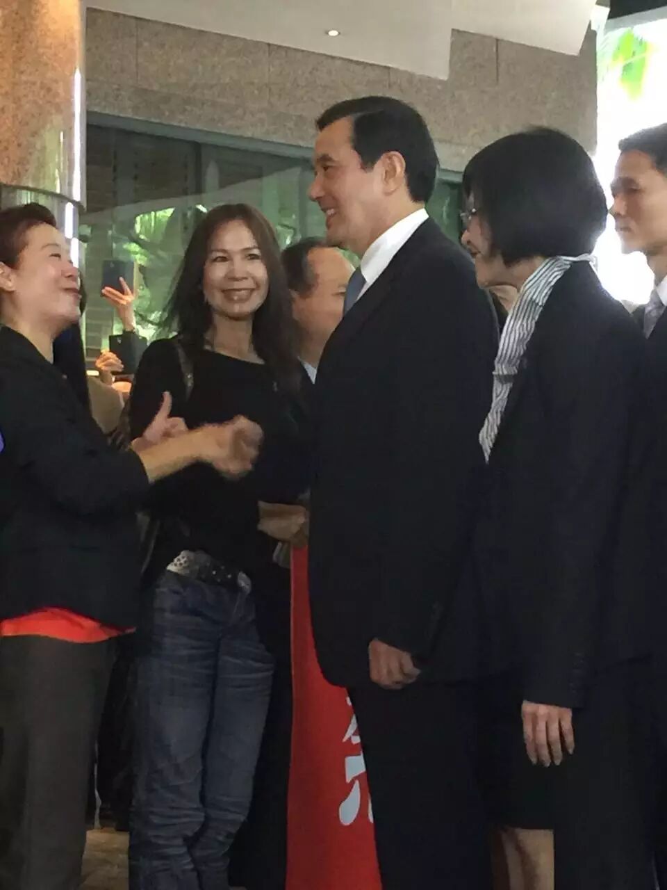 马英九在晚宴结束后,穿过酒店大堂时向两边民众致意,然后离开。