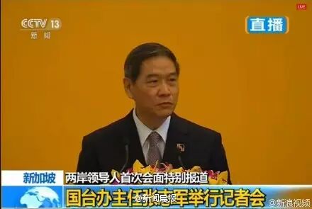 据央视消息,国台办主任张志军在发布会上称,两岸领导人以相互尊重态度,围绕推进和平发展,坦诚深入的交换看法,双方回顾两岸变化,总结两岸和平发展的经验。两岸领导人达成积极共识,双方认为会面对于两岸发展有长远意义,习近平表示见面翻开历史性一页,历史会记住今天。