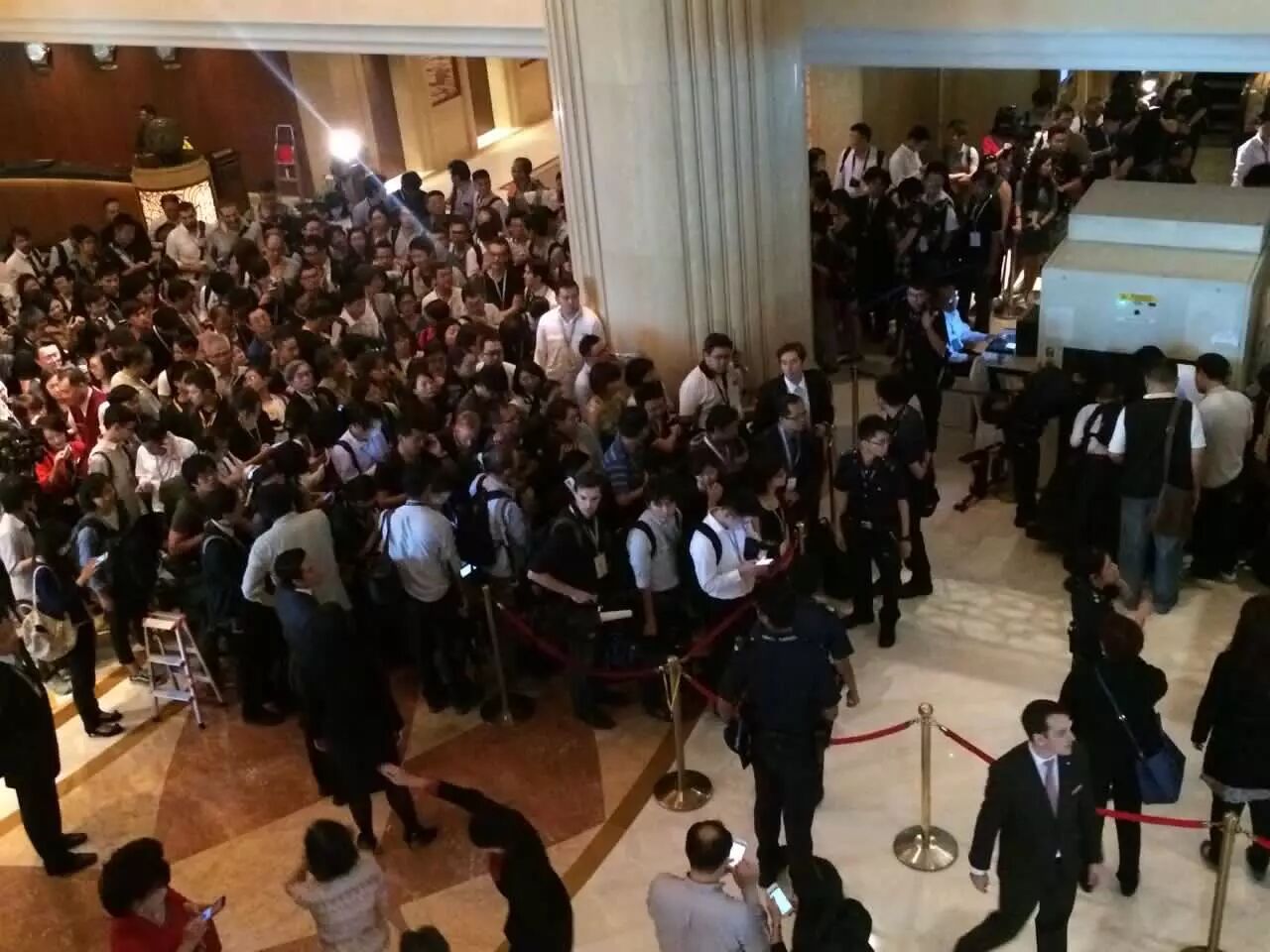 16时30分,来到香格里拉酒店门口。早想到会有媒体大战,但“战争”这么激烈,还是令人激动到无言:门外站满了取景的电视记者,大堂则是有史以来看到过的“最混乱”五星级酒店,现场的气氛早就被先期赶到的各路媒体烘托起来,摄影摄像机器与黑压压的记者群占据了全部大堂地带,所有的机位齐齐对准门外。