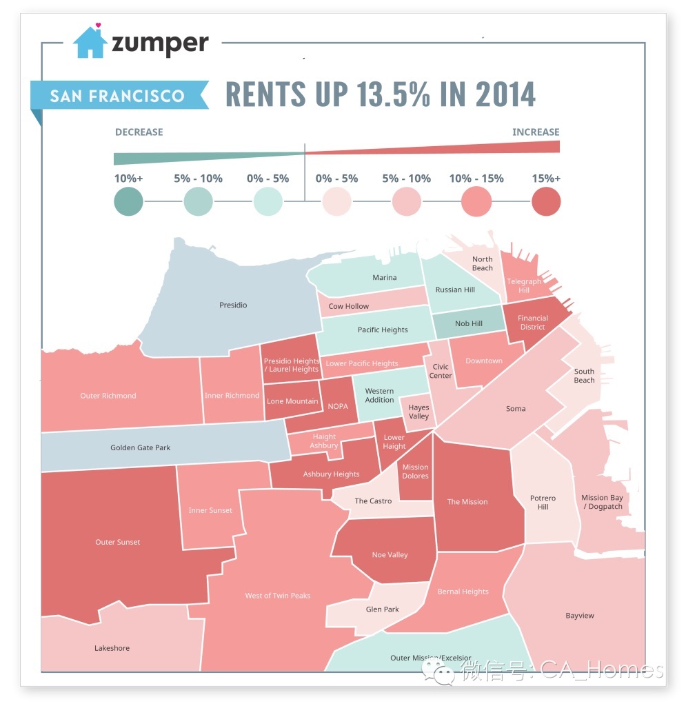 旧金山的两卧房公寓月租中位数,1月也涨了0.9%,达到4690元。旧金山市内,下列地区的租金最贵:俄罗斯山、南滩、米慎湾、狗坞(Dogpatch)、金融区和市场街以南区(South of Market)。