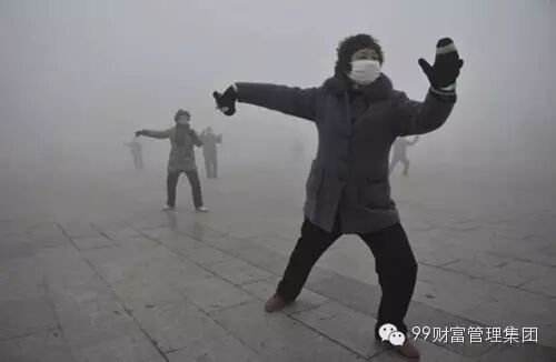 晨练的大妈们,呼吸着雾霾带着也许是劣质的口罩,有掩耳盗铃之势。