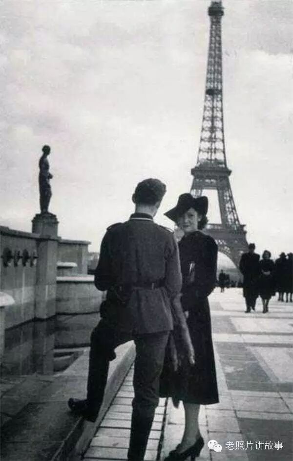 26、巴黎艾菲尔铁塔前,一个法国女人与德军士兵约会。德军占领法国后,有很多法国女人被迫或是自愿与德国士兵在一起了。德国战败后这些法国女人们都被游街示众,遭到各种侮辱