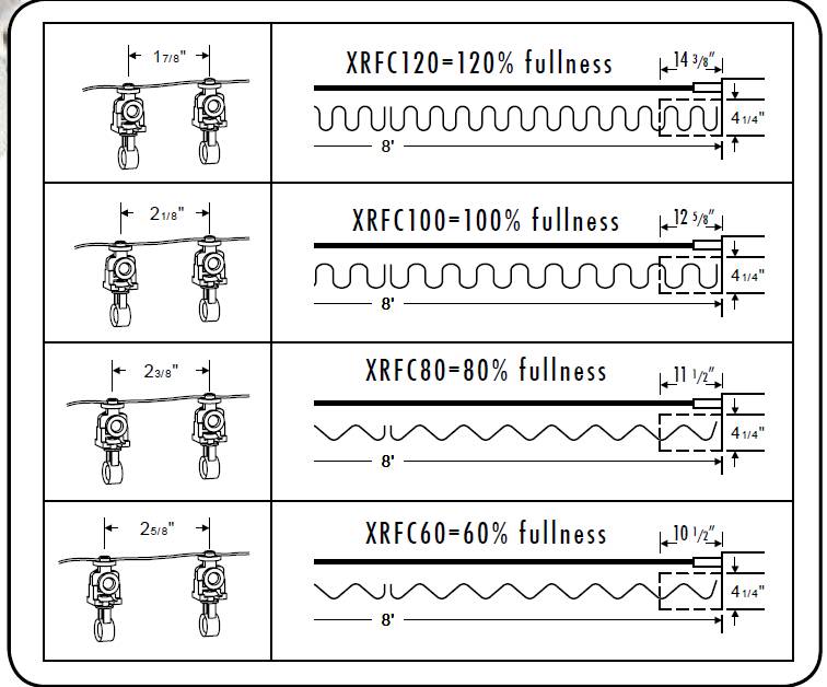 首先,Ripplefold形式是根据对窗帘褶皱程度(fullness)的不同,按一定的用料比例形成均匀曲线的,通常分为60% fullness,80% fullness,100% fullness,及120% fullness等。