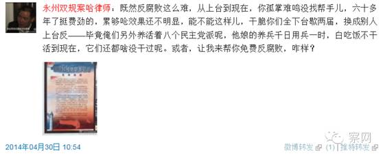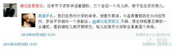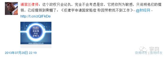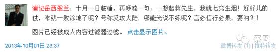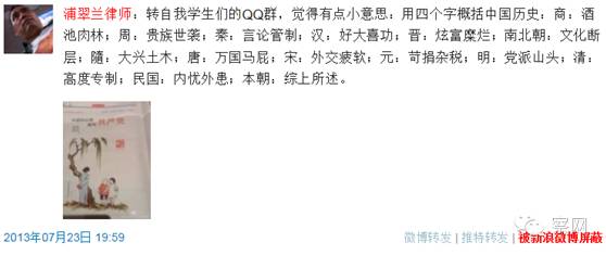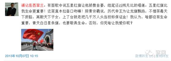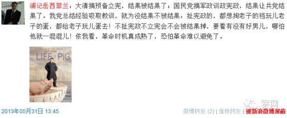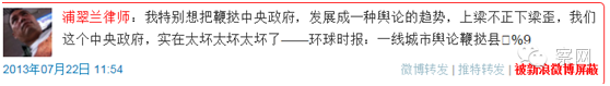 2013.4.17日11:05:17,浦志强账号“浦家岳西翠兰”称:“这个国家就是邪恶的。祸害六十多年,真的受够了。”