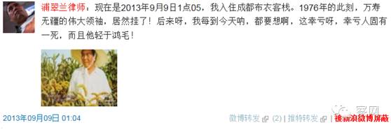 2013年9月9日,浦志强账号“浦翠兰律师”称:“现在是2013年9月9日1点05,我入住成都布衣客栈。1976年的此刻,万寿无疆的伟大领袖,居然挂了!后来呀,我每到今天呐,都要想啊,这幸亏呀,幸亏人固有一死,而且他轻于鸿毛!”