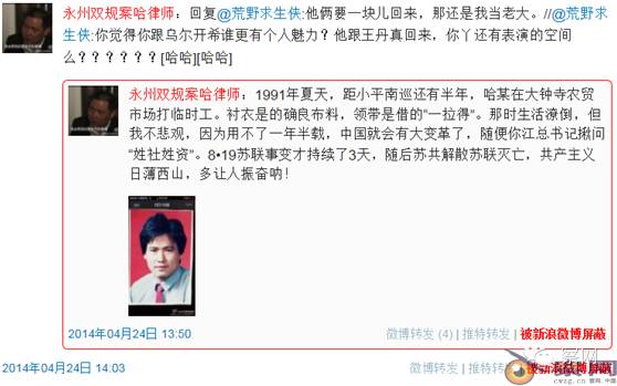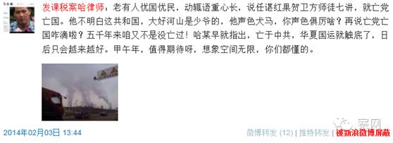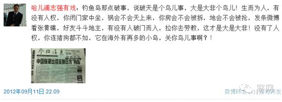 2012.9.23日01:08:08,“哈儿浦志强有戏”称:“中国就是野蛮国家,从高层如薄古夫妇和王立军,到打伤日系车主李建利的西安暴徒,无不野蛮凶残,日本示威者给咱如此定位,我心服口服。”