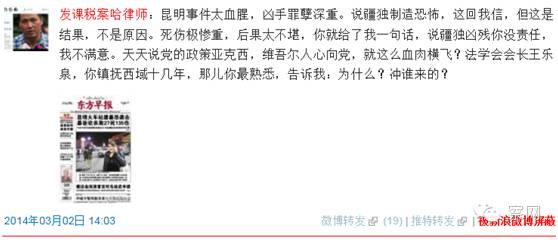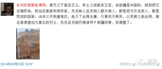 2014年5月1日,浦志强账号“永州双规案哈律师”发微博称:“普天之下莫非王土,率土之滨莫非王臣,说新疆是中国的,就别把它当殖民地,别当征服者和掠夺者,先发制人后发制人都为制人,都是把对方当敌人,都是荒谬的国策。冰冻三尺积重难反,免不了会再出事,只要民不畏死,以死惧之就没用,袭击者渴望成为真主的烈士,先发后发能吓唬谁呀?新疆政策,该调整了。”