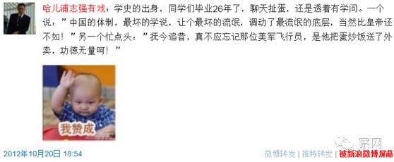 2012.9.27日13:20:46,“哈儿浦志强有戏”称: “身在法兰西,心系伟大祖国,哈儿以发课律师的身份,把心里的话儿,择要告诉你:伟大光荣正确的中国,呀!让我咋说你好呢?你就是一只臭虫,你是一只苍蝇,你还是一只屎壳郎!你她妈的算什么东西?!呸!”