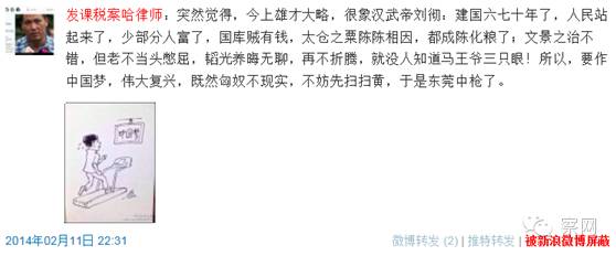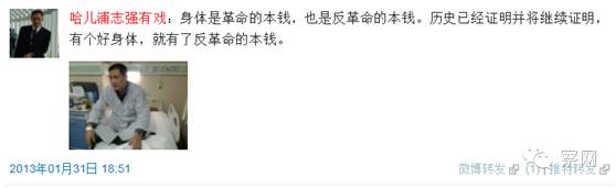 2013年1月31日,浦志强账号“哈儿浦志强有戏”称:“有个好身体,就有了反革命的本钱。”