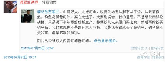 2013.11.3日16:53:42,浦志强账号:“浦律师在山巅”称:“是中国的你就拿回来嘛!告诉你,钓鱼岛是不是中国的,跟我一点关系没有!九十年没行使治权,以前没行使过治权,人民日报还恭喜过日本,你说现在是中国的了,去跟日本人说呀!你少跟我臭来劲!把中国交给日本治理,比现在好一万倍,知道吗?!”