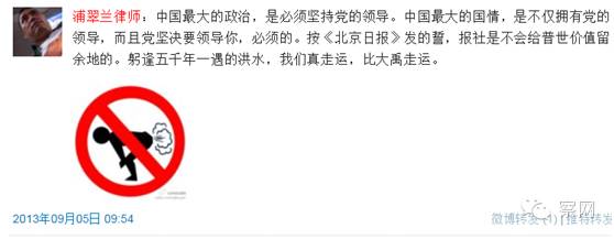 2013年9月5日,浦志强账号“浦翠兰律师”称:“中国最大的政治,是必须坚持党的领导。中国最大的国情,是不仅拥有党的领导,而且党坚决要领导你,必须的。按《北京日报》发的誓,报社是不会给普世价值留余地的。躬逢五千年一遇的洪水,我们真走运,比大禹走运。”并配了个恶心的 图片。