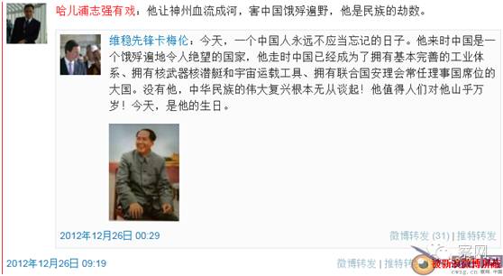 2012年12月26日,浦志强账号“哈儿浦志强有戏”称:“他让神州血流成河,害中国饿殍遍野,他是民族的劫数。”