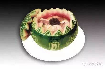 西瓜鸡处理西瓜很讲究,瓜要大小适中,顶端处横向切开,将瓜瓤挖尽,在西瓜表皮上刻花,冠云峰、虎丘剑池、寒山寺钟楼等。将清蒸好的童子鸡装入西瓜皮囊中,盖上瓜盖,便可上桌。