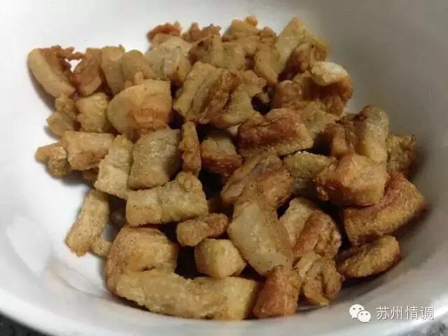 肥猪肉切成小块儿,放在烧热锅里,不一会儿,肥肉就缩啊缩地成了小小的硬块,熬出来的猪油是吃菜饭时候的最佳搭档,沥干油就剩下了金黄色的油渣儿。放在盘里稍撒上些盐,就可以端到桌子上,味道特别香。