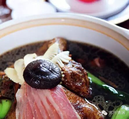 母游船鸭便是苏州船宴的佼佼者。整只鸭子走油后,放入香菇、冬笋、猪肉丝等辅料,浇入苏州著名的母油(选优质酱油从三伏晒制到秋天后,挑其中最好的一层"母油"),在砂锅中煨制,原汁原味,香飘十里。