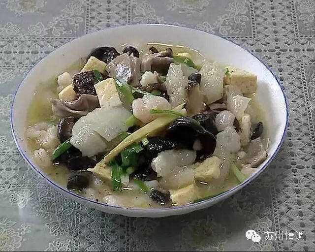 用料有海参、蹄筋、虾仁、肚子、鱼片、蛋糕(蛋蒸的糕)、香菇、木耳、笋尖等,真所谓是风格纷呈、气象万千。不过原则上还是白汤白炒原汁原味,这里以体现了苏州人的审美情趣和风雅格调。除了在口味上符合苏州人,视觉上也符合苏州那种古色古香的浅色调。
