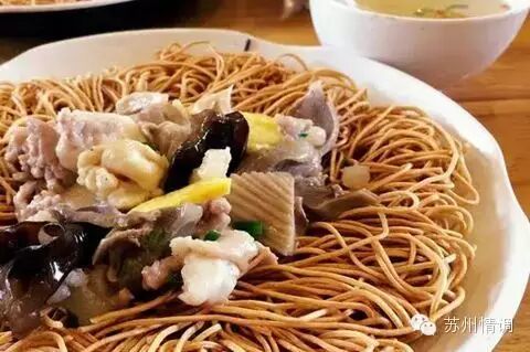 两面黄是一种苏州传统的面食名吃,曾被称为“面条中的皇帝”,价格不菲。解放后就很少供应,消失已有二三十年,近年来在苏州老字号餐饮界再次兴起。