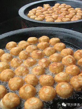 油氽团子,也是不得不提的一道苏州点心,选用上等糯米粉,夹心猪肉做馅,油氽团子下锅前就和肉汤团差不多,下锅油氽10分钟,等到外表变得金黄微微有些弹开来了,就差不多好了。