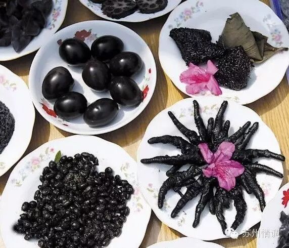 黑色的饺子、粽子、花生、面条、鸡爪、寿司……所有的菜都是黑乎乎的,像是在墨汁里浸泡过一样。趣味横生的乌米文化展曾经还原了曾经失传70多年的民国官宴——黑官膳。