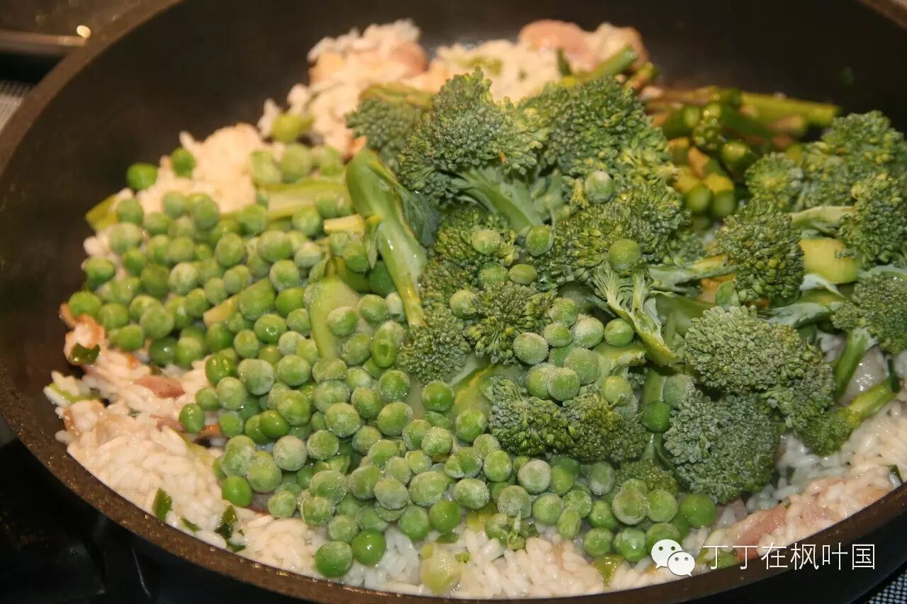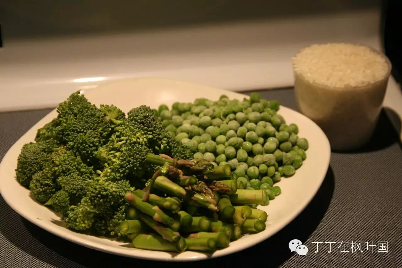 主料是米和绿色蔬菜,常用的有西兰花,西葫芦(美加的华人超市叫意大利青瓜,英文叫zucchini),芦笋,豌豆。我家没有西葫芦了,这个就省了,大家缺几样或者放几样其他的也都关系不大。豌豆我就直接用速冻的,不用解冻,当然新鲜的更好,罐头的也行。米我用的是那种长米,以前也用一般的大米甚至泰国香米,也都不难吃。这个菜实际上操作特别简单,大家可以多尝试,找到自己最喜欢的口味。