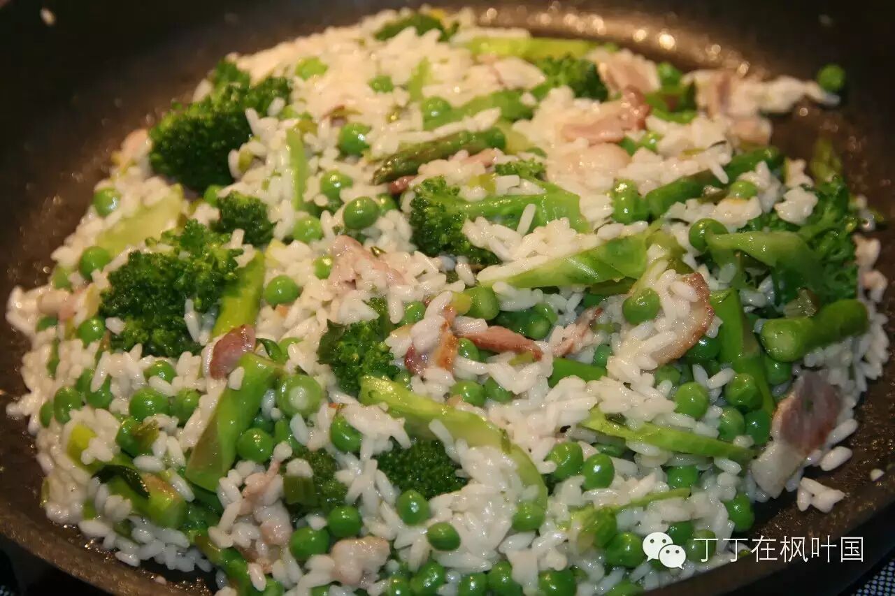 意大利米饭一般不会焖成中国的白米饭那种软度,吃起来微微有些硬为好。喜欢软些的可以在加蔬菜之前多焖一会儿,但也不要完全煮熟,因为后面还要加蔬菜在火上继续翻炒。炒的过程中希望饭更软的可以向里面加水。待蔬菜变成深绿色,米饭粒略鼓闪着油光就可以关火加盐和黑胡椒了。