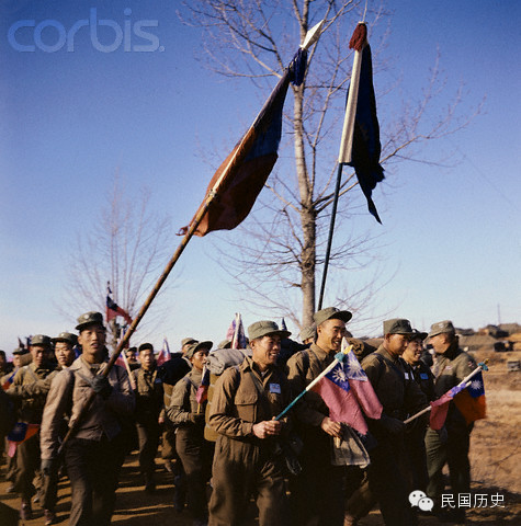 换上国军服装的前志愿军战俘,招摇着国军军旗,表情愉悦地发走出中立区战俘营