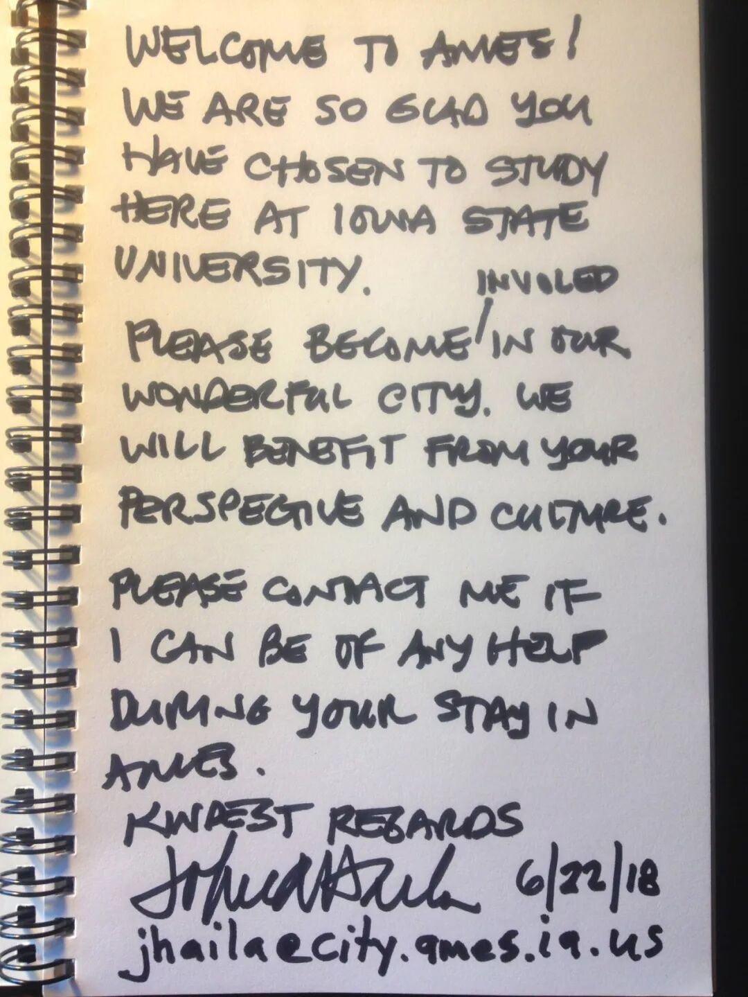 “欢迎来到埃姆斯!我们非常高兴你能选择在爱荷华州立大学学习。请参与融入这座美妙的城市,我们将从你的见解和文化中受益。如果你在埃姆斯的生活中有任何需要我帮助的,请联系我。