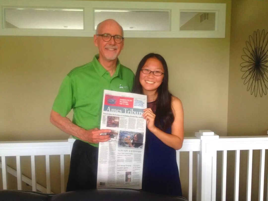 (海拉市长平时主要阅读《华尔街日报》和埃姆斯本地日报《埃姆斯论坛报》,他欣喜地阅读到封面刊发美国无国界教育优秀学生蓝以青(右)的专访报道,鼓励青年学生主动为自己寻求机遇、发展兴趣、追求梦想)