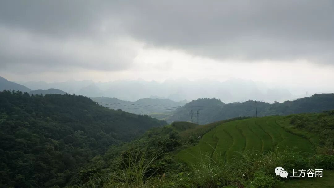 很显然,山里是下过雨的,在半山腰远眺巴马,群山延绵不绝,薄雾蔼蔼,根本看不见一丝县城的踪影。