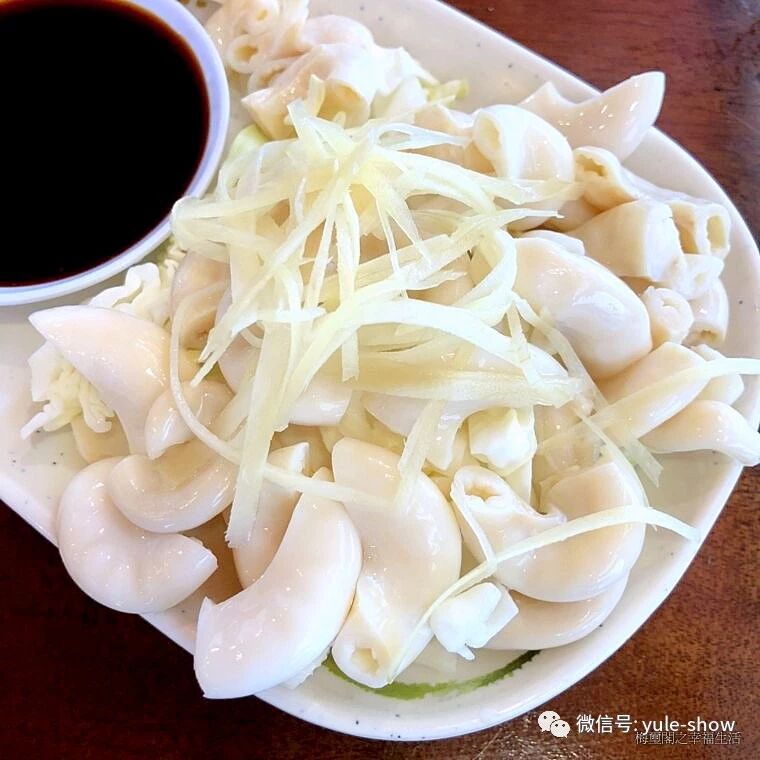 说是“白切”,这生肠可真是白啊!完全可用“羊脂白玉般”来形容了。圆圆弯弯的一截截,很是可爱。挟一条,就着姜丝,蘸一点酱油膏,吃口很Q,“Q”是台湾话,很有弹性的意思。