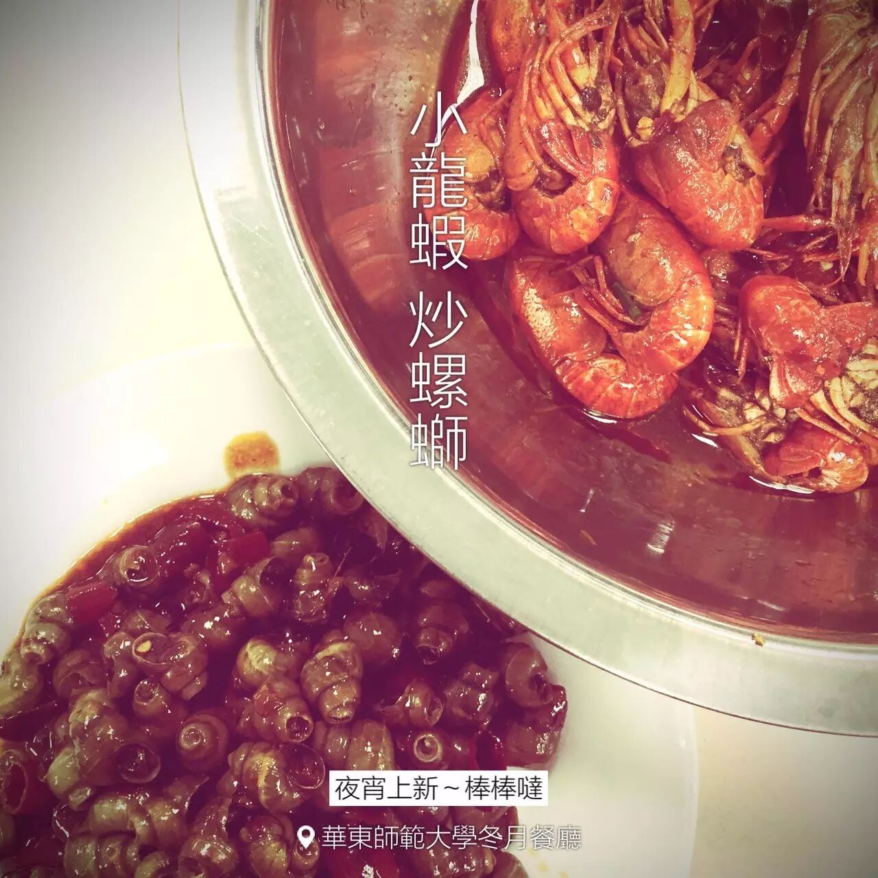 “食堂夜宵品种繁多,泡椒凤爪、糟毛豆、各色炒粉炒面等等,每种都配好放在窗口供大家选择,现点现炒~主打的小龙虾(28元一斤)和炒螺蛳(8元一份),是事先做好浸泡在汤汁里的。别看小龙虾个头不太大,但经典十三香的佐料,色泽红亮,口味辣鲜香,质地滑嫩,十分入味。掰开带着余温的小龙虾,吸一口汤汁,再吃掉虾肉,不要太完美哦~螺蛳也比外面弄得干净,粒大肉肥,吃货们不能错过呀!再配上特供啤酒(2.8元一瓶),从此告别黑暗料理,麻麻再也不用担心啦~”