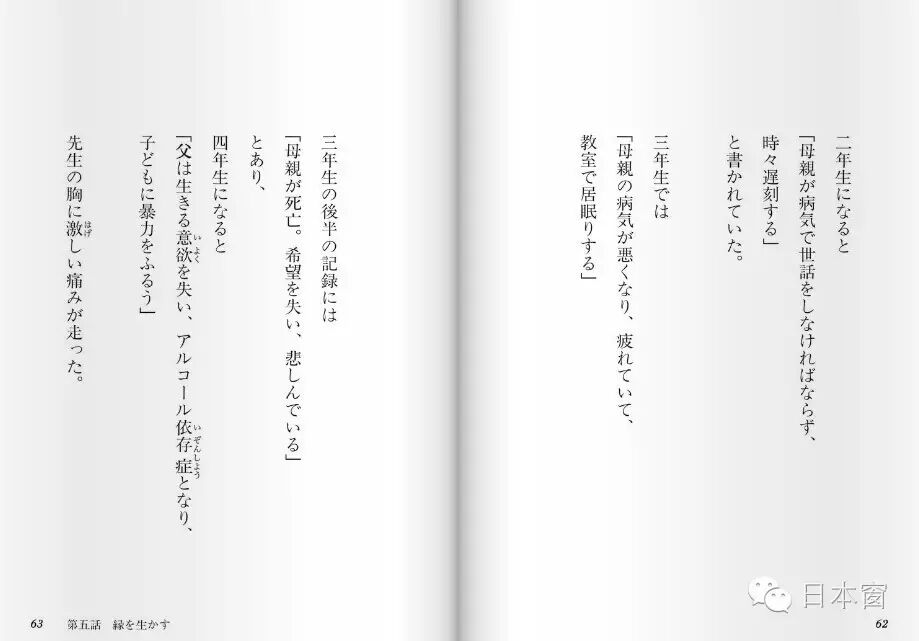 书中最反响最大的是第5话「縁を生かす」(缘起),讲述了「一位小学女老师改变一个少年人生」的真实故事。东京电视台还专门制作了一期引起巨大轰动的节目,在文章最后可以看到这部7分钟的短片。