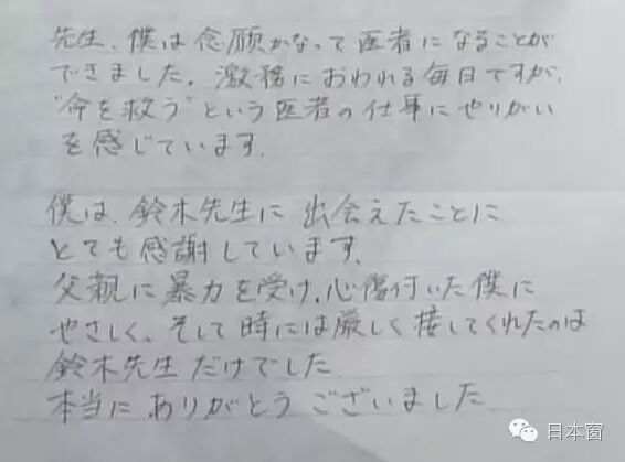 在格式化的客套之后,一行工工整整的手写字让铃木老师泪如雨下。