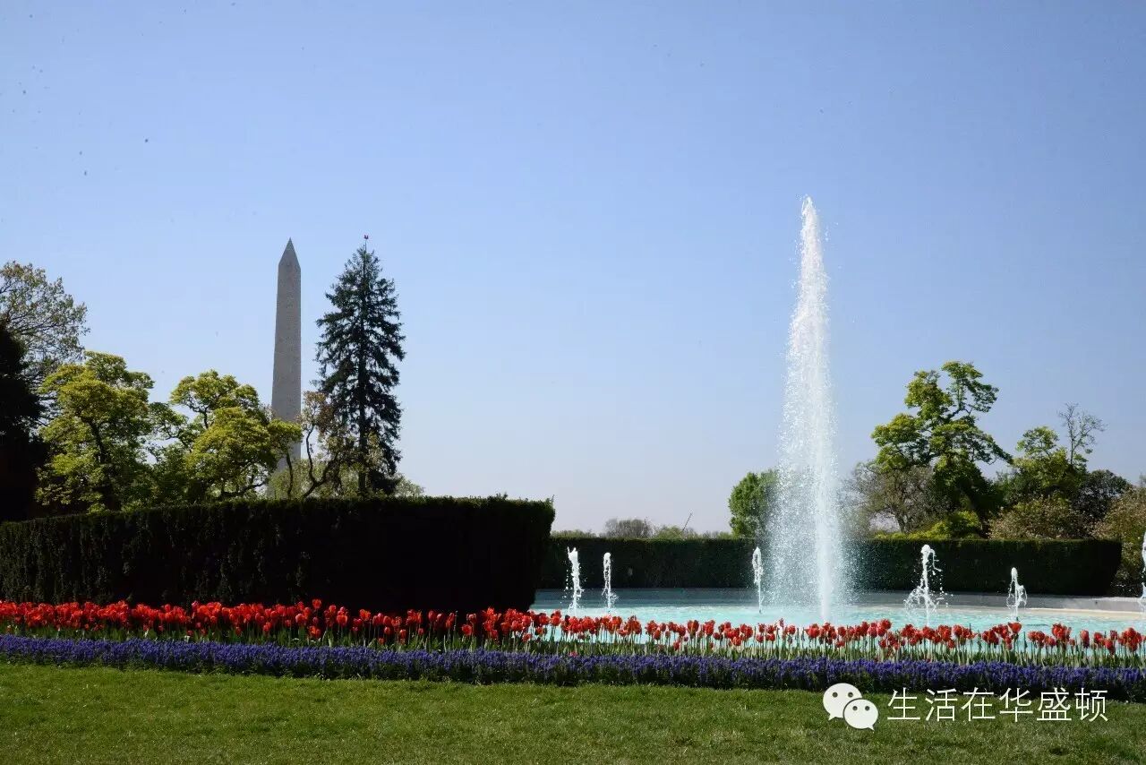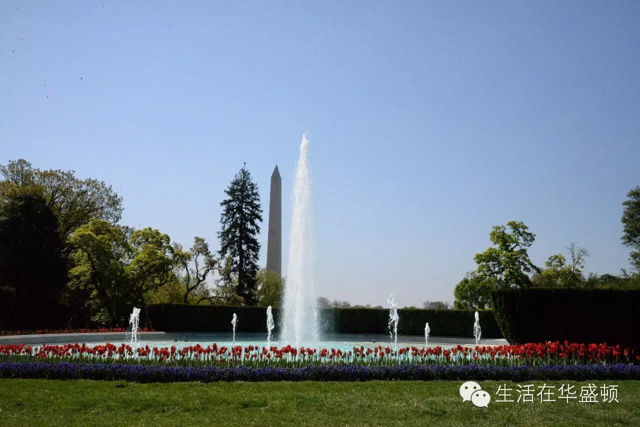 一路前行,喷泉的身姿在远近高低不同背景下,呈现不同风情。站在白宫主楼宽大的门廊前,南面而望,眼前豁然开朗。宽阔的南草坪,中间一圆形水池,不断舞动的喷泉,映衬华盛顿纪念碑伟岸的身影,愈显袅娜多姿。