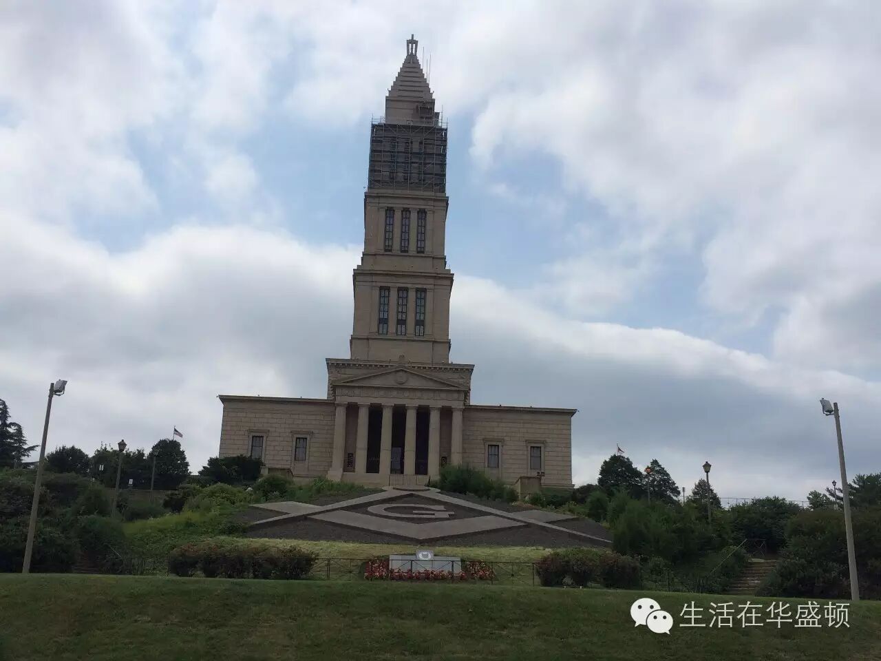 这周三的天略有阴沉,偶尔洒下一、两滴雨,驱车近半小时,来到位于亚历山德里亚的纪念堂。远远便能望见其高高的尖顶耸入云间,底座似乎建在一个硕大的拱起的小山包上。正门前面的斜坡上巨大的的共济会徽标召唤我沿着一侧甬道前行,新剪的草坪发出清新的香气,太阳仍未露脸,只从云层的空隙里透出光来。