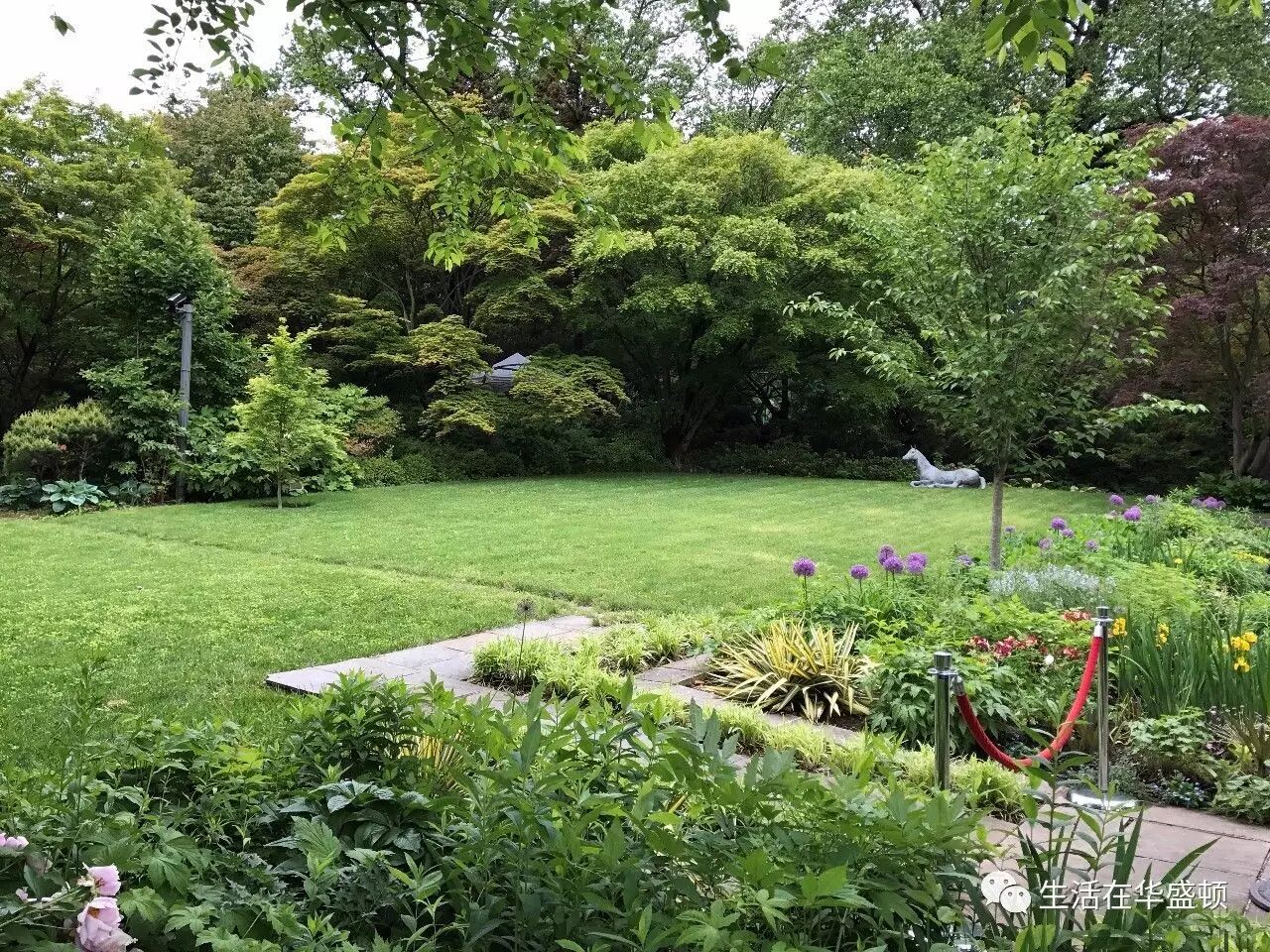 外面的紫藤花园里一匹石马正卧在青草地上休憩。这个花园建于1930年,由埃德温.莱特森爵士依照格特鲁德.杰基尔风格设计。后者是二十世纪最负盛名的英国女园艺家,设计注重结构、比例、色彩、气味和质感,其设计作品冲破传统规则式布局的束缚,展现自然式花园的生命力。鲜花盛开的时候,使馆的蜜蜂们采百花酿蜜供给馆内人员享用。